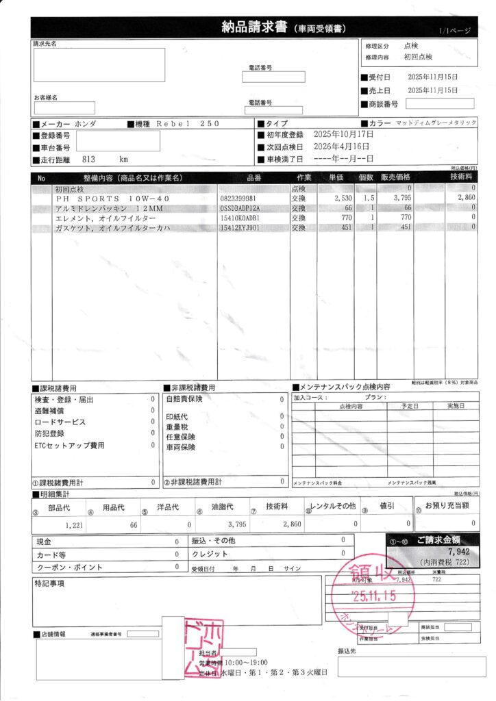 HOME > バイク > Rebel250 > Rebel250 バイク バイク 一ヶ月点検 更新日:2025年11月28日 2025年11月15日 レブル250一ヶ月点検の日。 10月18日に納車して土日は九十九里(千葉の海)・城南島海浜公園(東京羽田空港近くの飛行機が近くで見える公園)・霞ヶ浦総合公園(茨城の湖)などに出かけて一ヶ月で813Kmほど走りました。 エンジンオイルとフィルターを交換して7,942円。 -Rebel250, バイク -Rebel250, バイク, 普通二輪, 記録